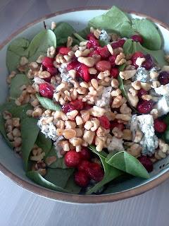 to roast cranberries, coat in some oil or spray with canola, i like the spectrum high heat canola spray, and spread out on sheet pan/cookie sheet, pop into a 400 degree oven til just soft, about 15 minutes. to toast walnuts spread out on cookie sheet and pop into 400 degree oven til light and toasty smelling, about 8 minutes, keep a constant eye on them, don't let burn! either use pieces or run through a quick trip in the food processor. once the above are done and cooled, assemble everything in a big serving bowl. instead of tossing this salad i would put half the spinach on the bottom of the bowl, then half the cranberries, blue cheese, and walnuts, and then repeat on top of it with the other half, it will make for a cleaner presentation and then there is no need to toss.